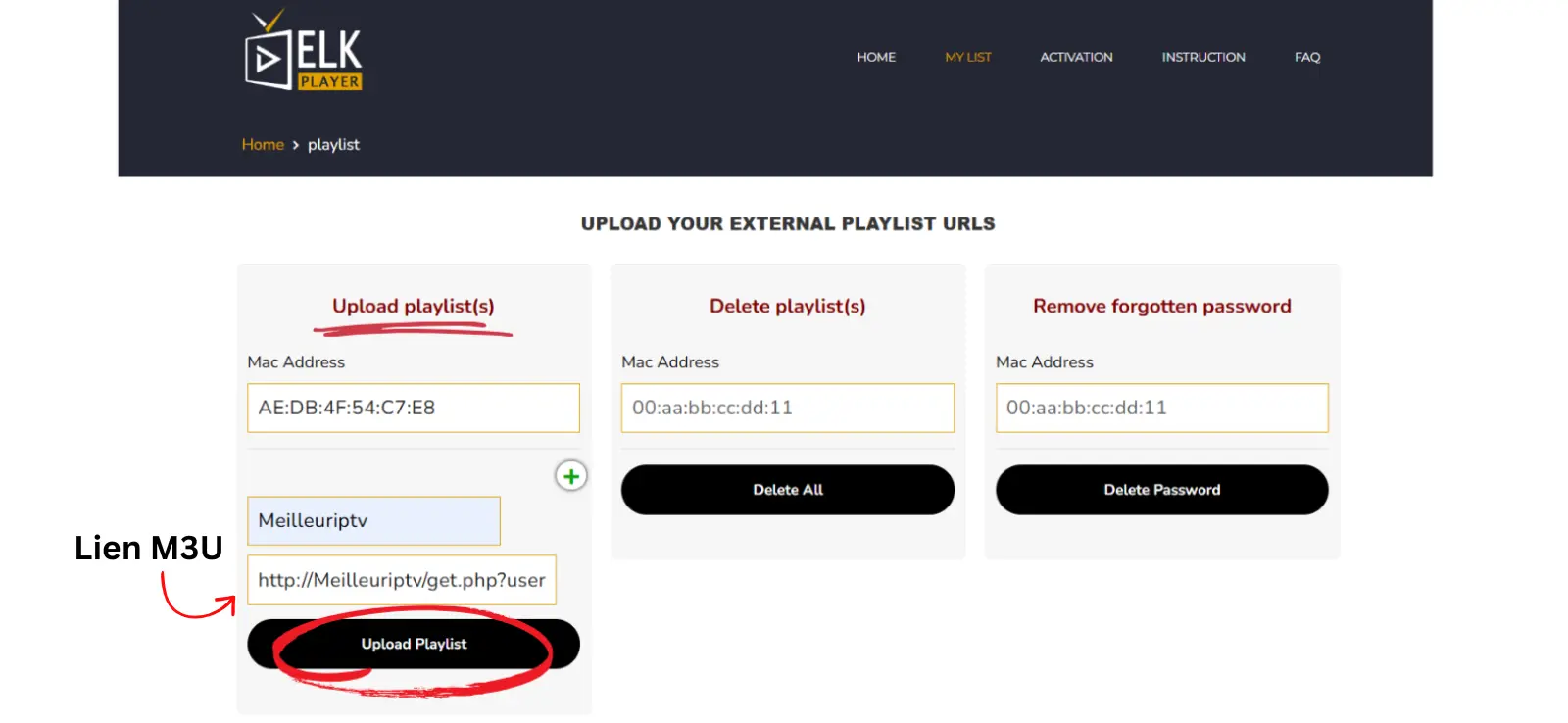 Une fois sur la page d’activation https://elkplayer.com/list, suivez ces étapes pour ajouter votre abonnement :